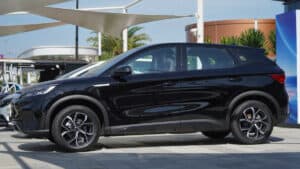 Phần thân xe BYD Atto 3 được thiết kế khỏe khoắn với các đường nét mạnh mẽ. Tay nắm cửa đồng màu với thân xe, tạo sự đồng nhất trong tổng thể thiết kế. Một đường viền ốp nhựa màu đen chạy xuyên suốt từ đầu xe qua vòm bánh xe, dọc theo cửa xe và kéo dài đến phần đuôi, vừa tăng thêm vẻ thể thao vừa bảo vệ các chi tiết ngoại thất.