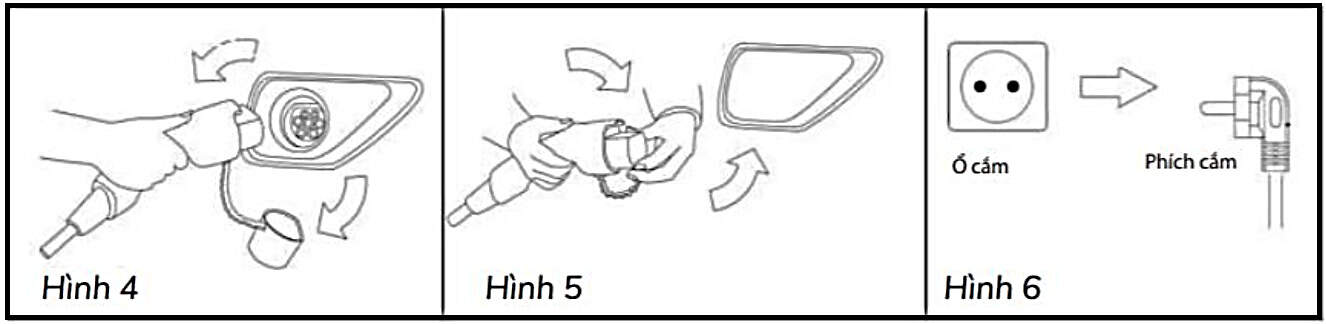 Bước 4: Rút đầu sạc ra khỏi xe (Hình 4), đóng nắp bảo vệ cổng sạc trên xe, sau đó đóng nắp bảo vệ đầu sạc của bộ sạc (Hình 5).